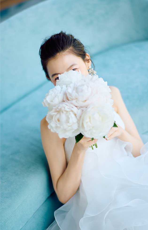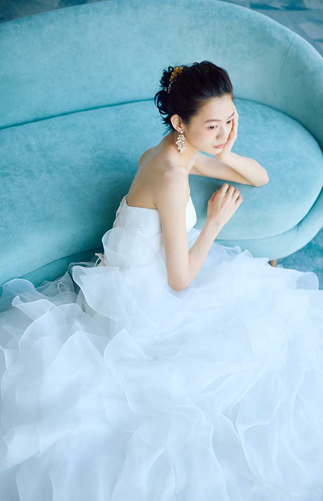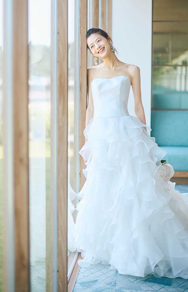 花言葉「門出」。繊細なシャンティレースのトップスにまるでスイートピーのお花のようなラッフルスカートがロマンチックな一着。歩くたびに軽やかにヒラヒラと動くように計算されたデザインは花嫁様を優美に魅せてくれます。