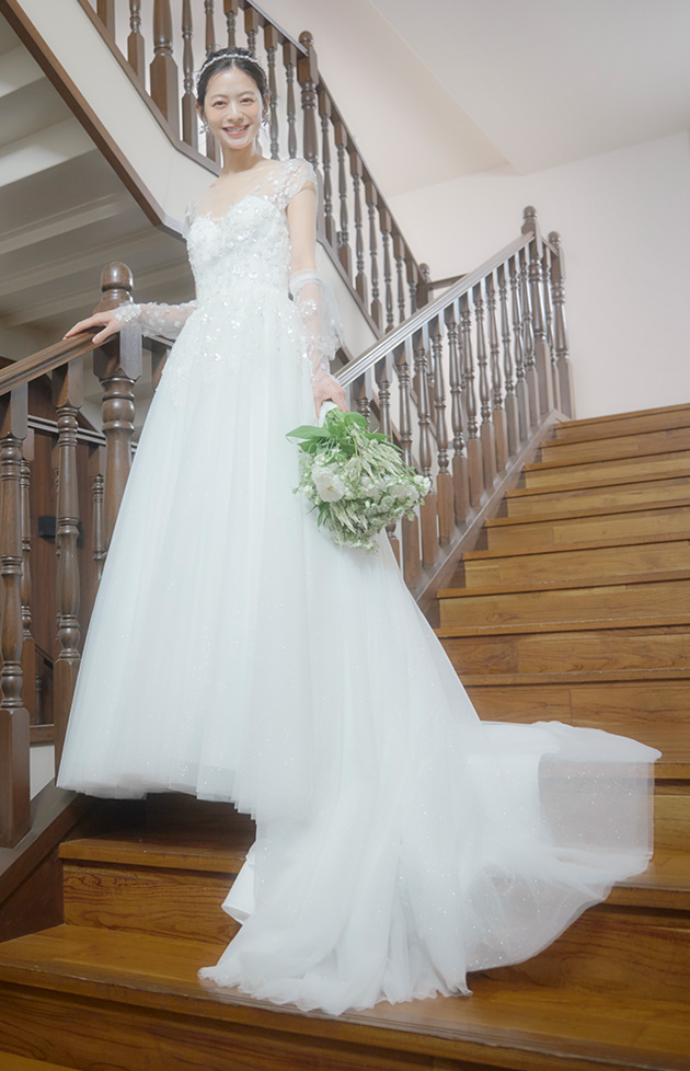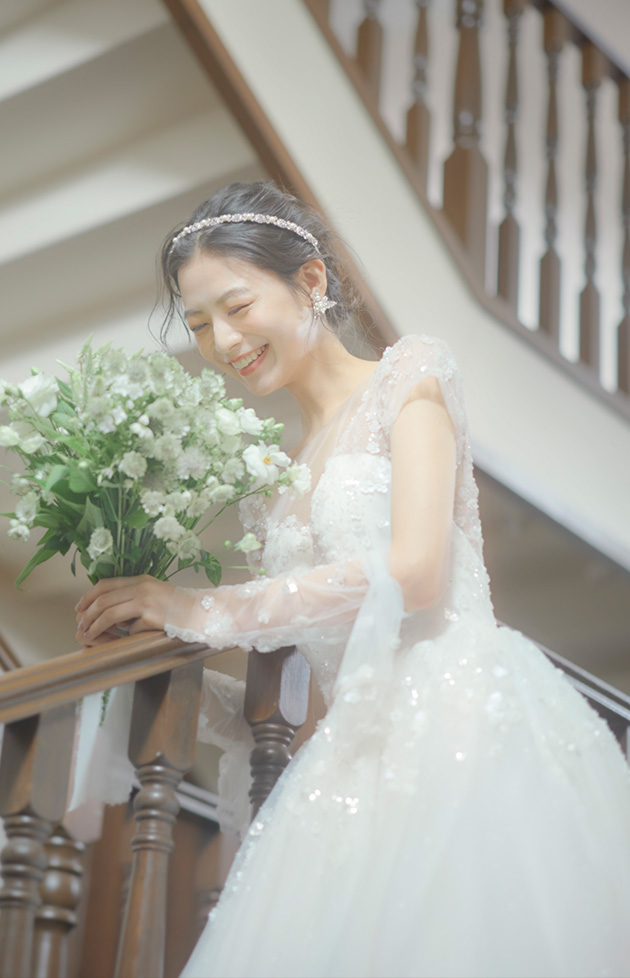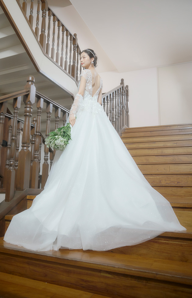 繊細なフラワーモチーフにスパンコールやビジューを重ね、ラメチュールをふんだんに使用した、主役にふさわしい煌めきを放つAラインドレス。肌に溶けこむイリュージョンネックと上品なキャップスリーブが、可憐な華やかさを添えます。バックスタイルは深めのVラインで抜け感をつくり、ふわりと広がるトレーンが光を受けるたびに柔らかな輝きを生み、動くたびに表情豊かに。360°どの角度から見ても写真映えする一着です。セットのフィンガーレスグローブが手元にまで立体的な輝きを添え、細部まで統一感のあるスタイリングを叶えます。