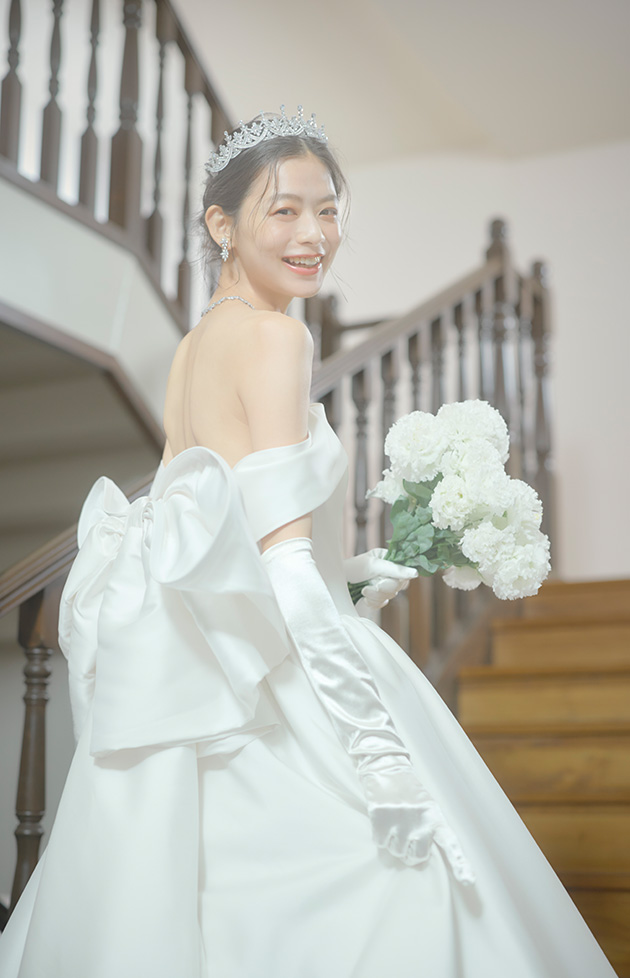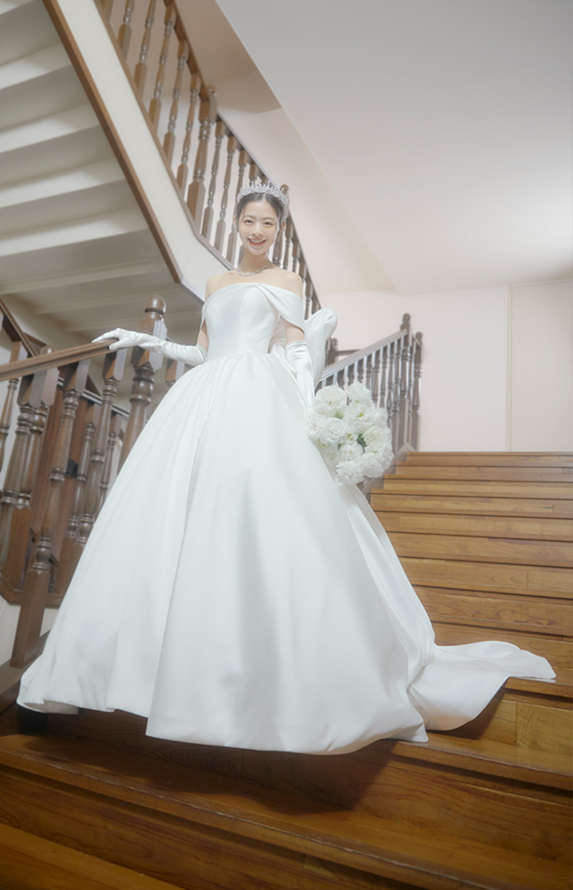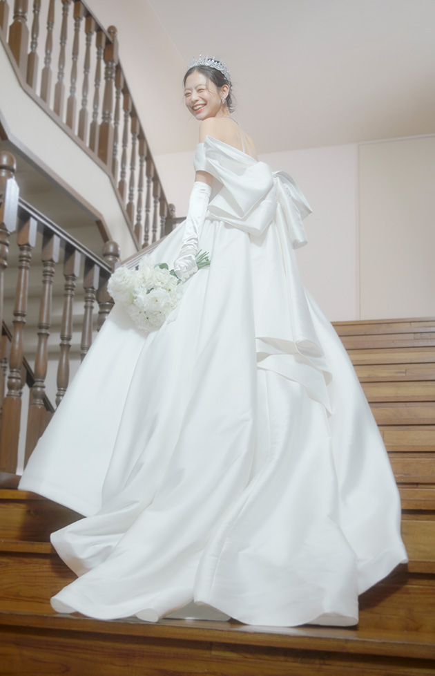 光沢のあるミカドサテンを使用した、クラシカルな気品漂うボールガウン。デコルテを美しく見せるオフショルダーは、ひねりを加えた左右非対称のデザインが印象的で、上半身を華やかに魅せてくれます。気になる二の腕をそっと包み込み、安心感のある着心地も魅力です。生地を贅沢に使用したスカートは、歩くたびに優雅なドレープを描き、階段やバージンロードでも存在感を放ちます。背中には大ぶりの立体的なリボンモチーフをあしらい、後ろ姿までドラマティックに。タイムレスな美しさを纏える、花嫁の理想を叶える一着です。