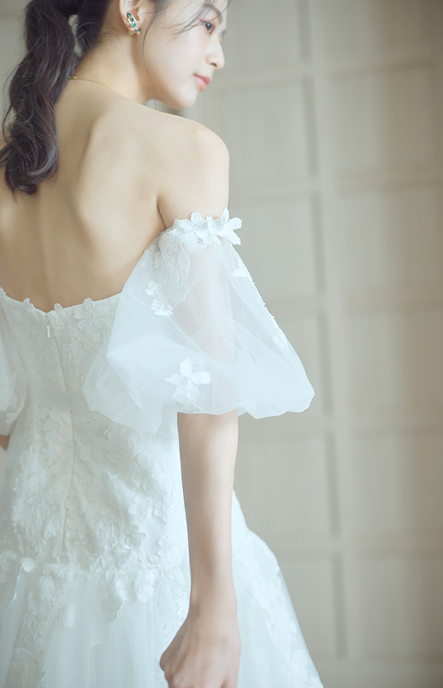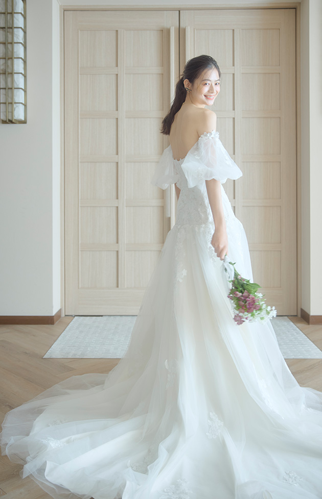 立体的なフラワーレースにさりげなくスパンコールをあしらった、纏うだけで女性らしさが引き立つセミマーメイドドレス。曲線美を際立たせるシルエットながら、チュールを重ねた柔らかな表情が、可憐な華やかさを添えます。トレンドのボリュームスリーブは、透明感のあるチュールにレースモチーフを散りばめ、袖全体がふんわりと柔らかなシルエットに。取り外し可能な2WAY仕様のため、ヘアスタイル、アクセサリー、ブーケまで、スタイリング次第でさまざまな表情を楽しめます。甘さと大人っぽさのバランスが絶妙で、等身大の可愛らしさを引き立てる一着です。
