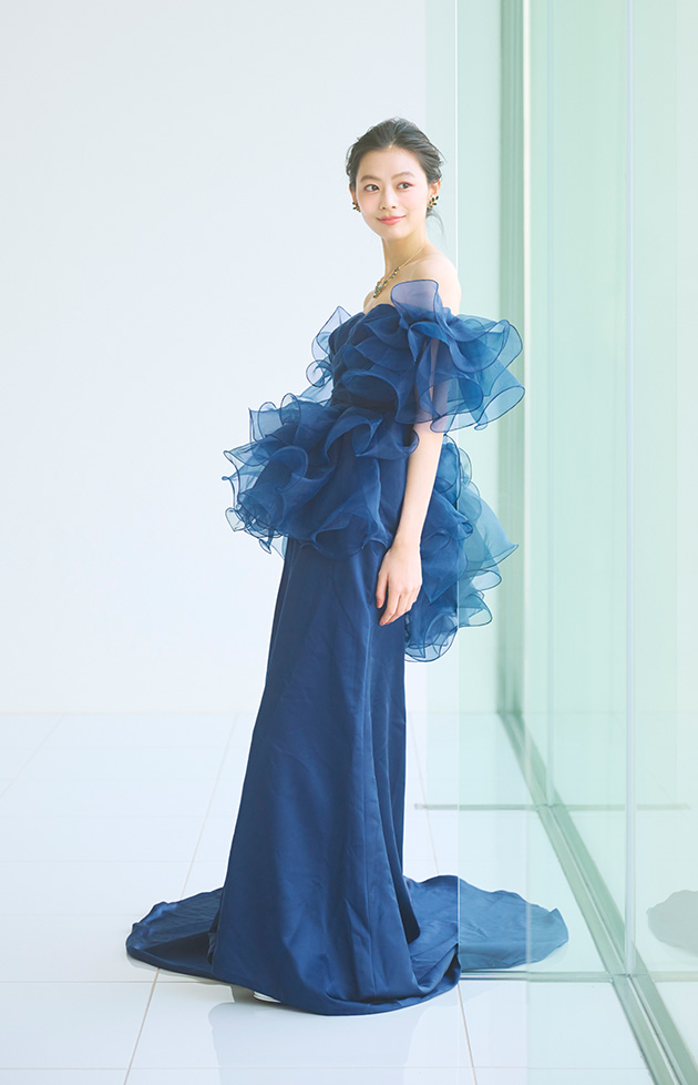 深みのあるネイビーカラーが肌を美しく引き立てる、4WAY仕様のカラードレス。ドレス本体はすっきりとしたスレンダーラインに、ボリュームスリーブ・ラメオーバースカート・ウエストフリルの3つの付属アイテムを組み合わせることで、シーンに合わせた多彩なスタイリングが叶います。披露宴ではオーバースカートやフリルをプラスして、グリッターの煌めきで華やかに主役感を演出し、二次会ではオーバースカートを外して抜け感のある洗練された装いに。特別な一日を、自分らしく楽しみたい花嫁さまへ贈る一着です。