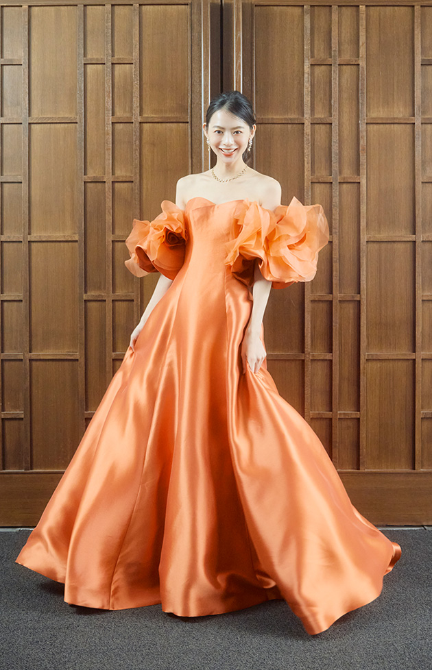 会場の視線を一瞬で惹きつけるテラコッタオレンジが印象的な一着。ミカド生地ならではの上質な光沢が、シンプルで美しいラインをよりいっそう引き立てます。ショルダーに咲く大輪のフラワーモチーフスリーブは、オーガンジーを立体的に重ねることで花びらのように咲き誇り、ロマンティックな印象に。写真に写った際もスリーブがアクセントとなり、肩まわりの華奢見えと圧倒的な写真映えを叶えます。特別な日にふさわしいドラマティックなカラードレスです。