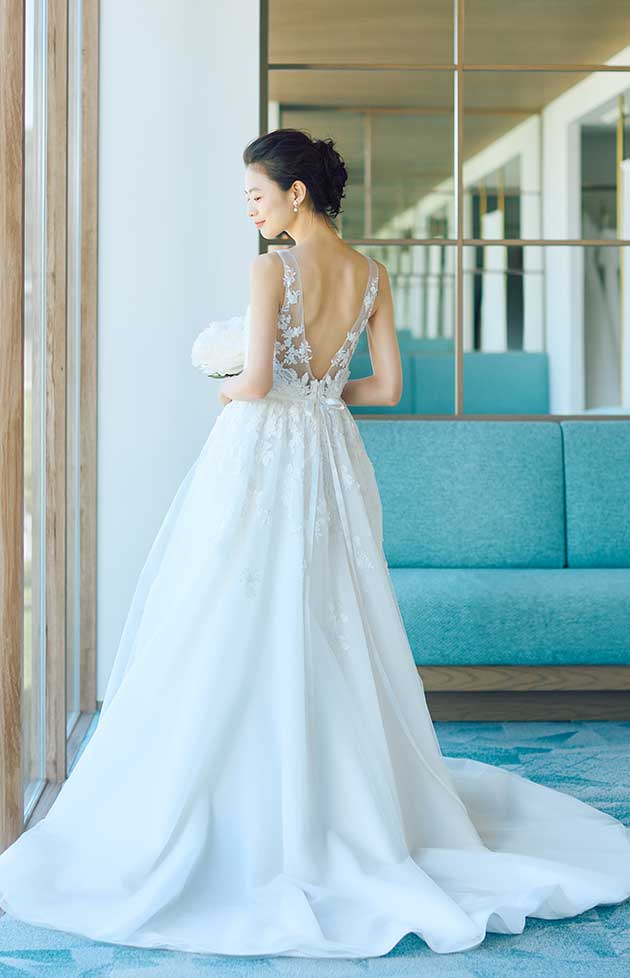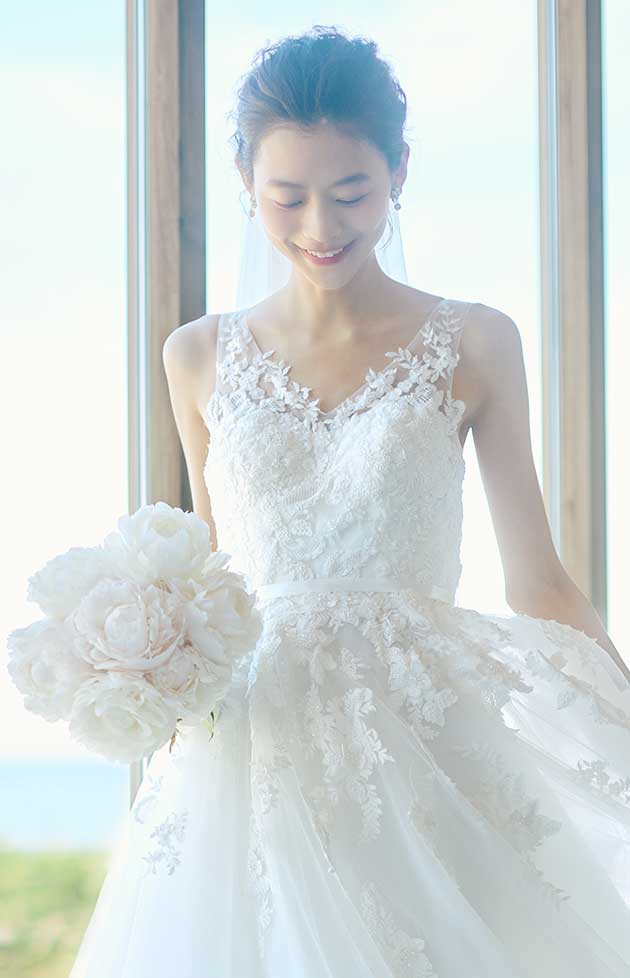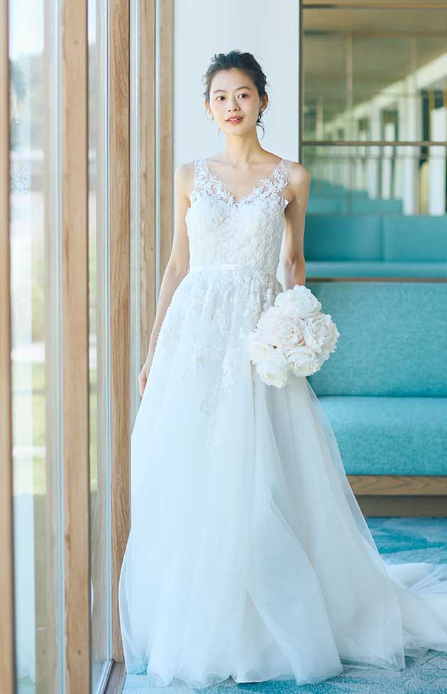 花言葉「小さな幸せ」。華やかな3Dフラワーモチーフのエンブロイダリーレースと、透明感のあるチュール素材の組み合わせが、ナチュラルな印象のウエディングドレスです。フロントとバックのVにあいたデザインが、上半身をすっきりと見せ、スタイルアップが叶います。フラワーモチーフが多く飾られているので、自然光の多い、緑がいっぱいの会場のお客様に特におすすめの一着です。