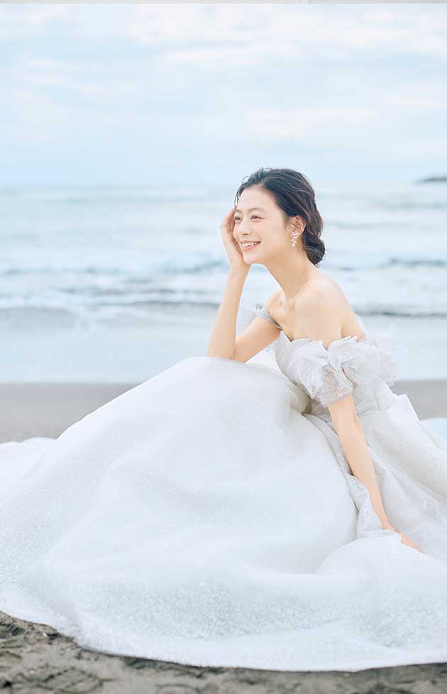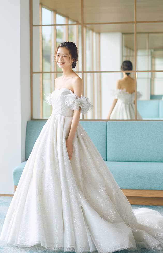 花言葉「あなたと一緒に」。贅沢にラメチュールにグリッターを施し、360 度どこから見ても圧巻の輝きを放つAラインのドレスです。ギャザーをたっぷりと使用したボリュームスカートが花嫁様らしい存在感を放ちます。立体的なデザインが目を引く、取り外し可能なオフショルダーは、動く度に優美さとお顔周りを華やかに映します。