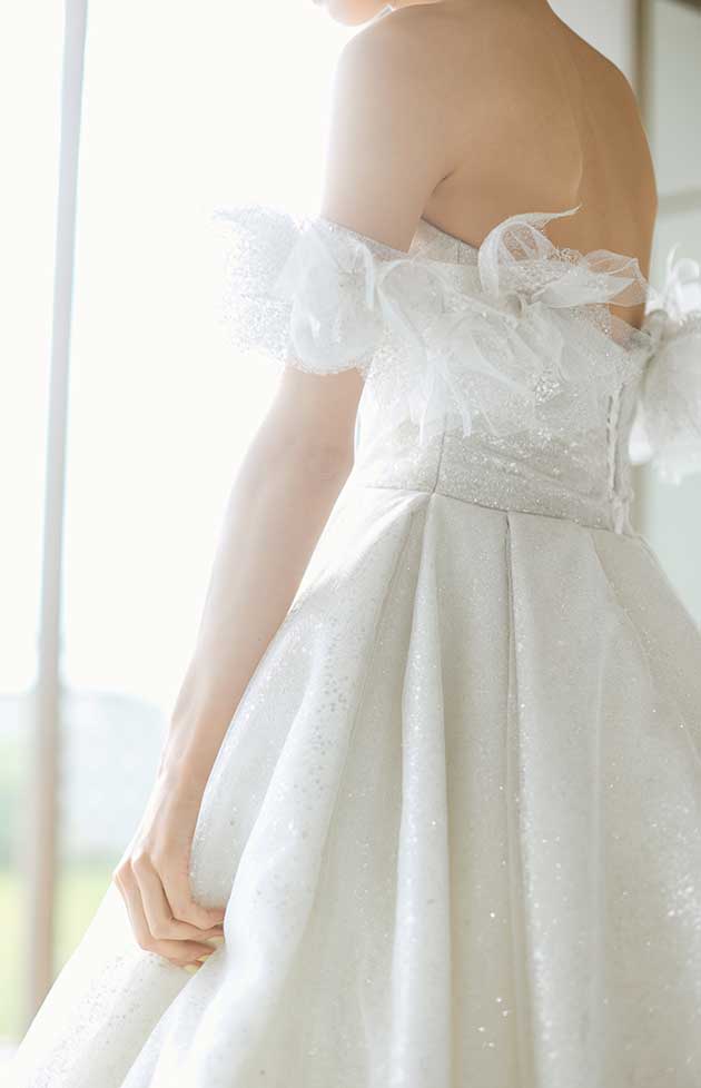 EC2403|花言葉「あなたと一緒に」。贅沢にラメチュールにグリッターを施し、360 度どこから見ても圧巻の輝きを放つAラインのドレスです。ギャザーをたっぷりと使用したボリュームスカートが花嫁様らしい存在感を放ちます。立体的なデザインが目を引く、取り外し可能なオフショルダーは、動く度に優美さとお顔周りを華やかに映します。