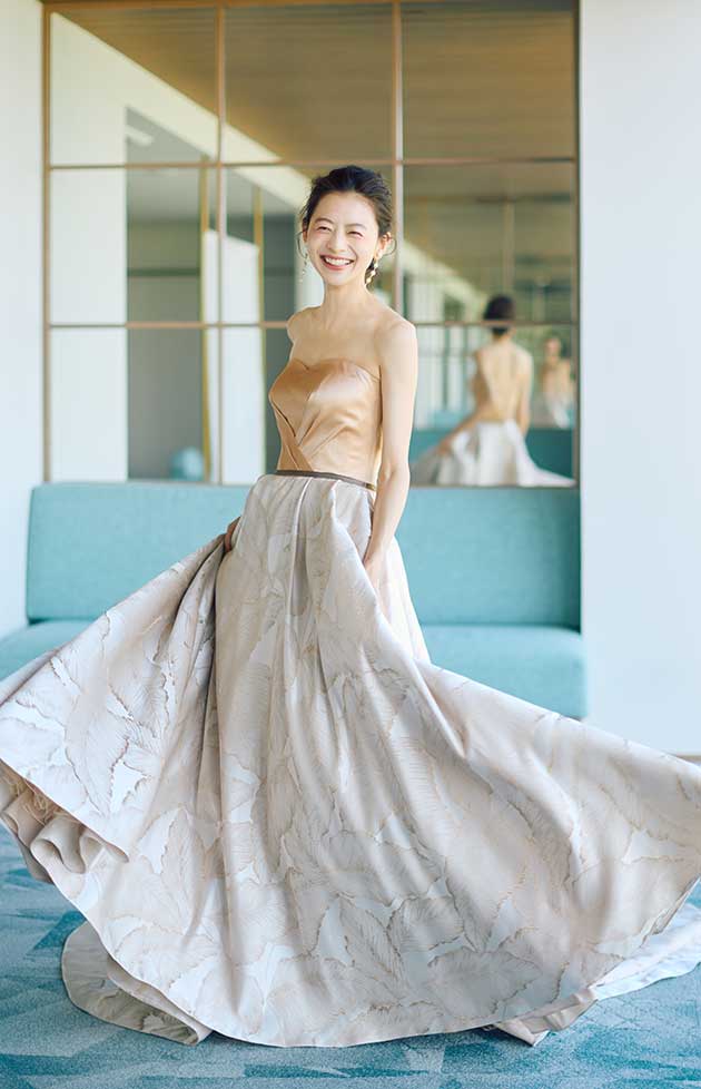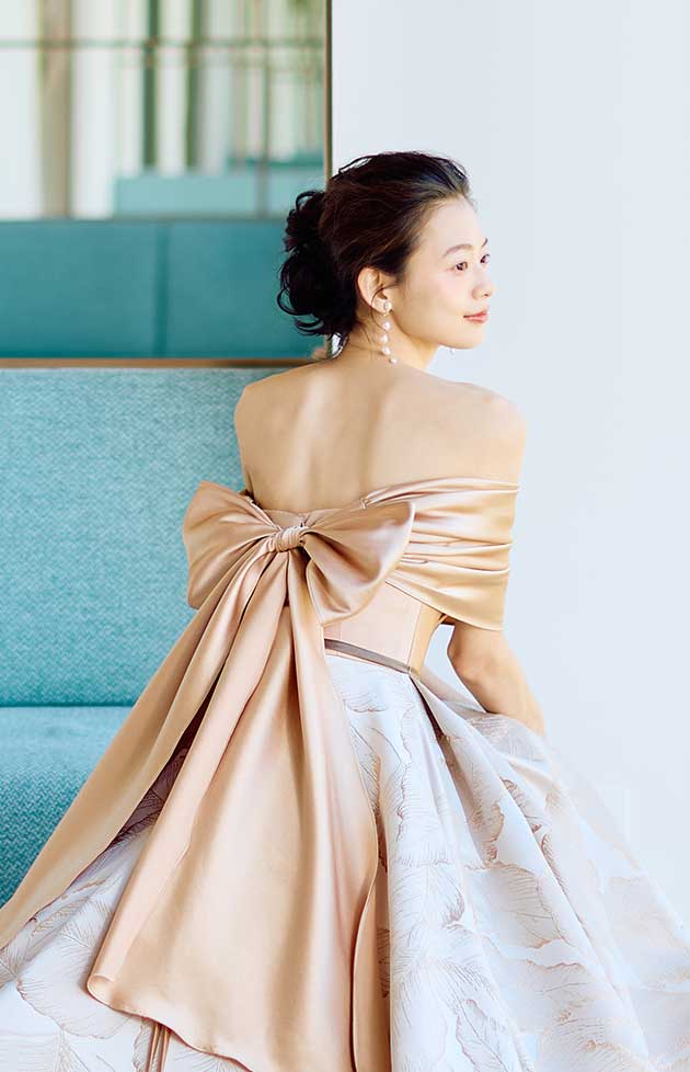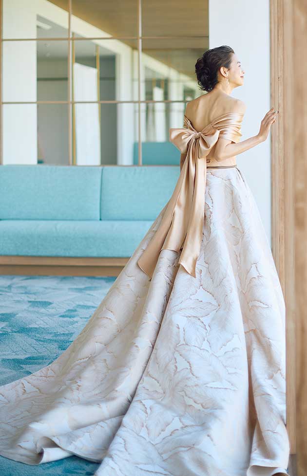 花言葉「優美・気品」。ハートカットのサテン生地のトップスに、スカートにフェザー柄のジャガード生地を贅沢に使用したキャメルカラーのAラインドレス。ウエストにタックをいれクロスするようなデザインは、ウエストラインを細く綺麗に魅せてくれます。取り外しのできるオフショルダーのサテンショールはバックスタイルをリボンで飾り、大人っぽさと可愛らしさとどちらの後ろ姿も叶えてくれる一着です。