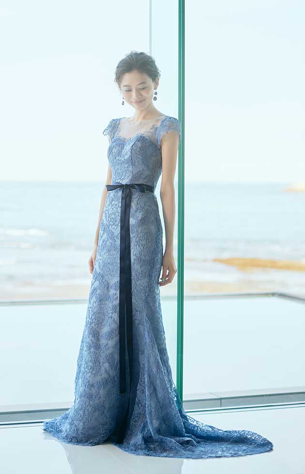 EC2405|花言葉「幸福な愛」。繊細なレースに立体的なレースを重ねたブルーグレーのトランペットガウンのカラードレスです。繊細なイリュージョンネックにキャップスリーブがお顔周りを華やかに優しい印象に魅せてくれます。ブルーグレーの柔らかい色味にアクセントにウエストにネイビーリボンを飾ることできゅっと引き締まりスタイルアップが叶いますバックスタイルは高い位置から広がるトレーンが、後ろ姿までドラマチックに映します。