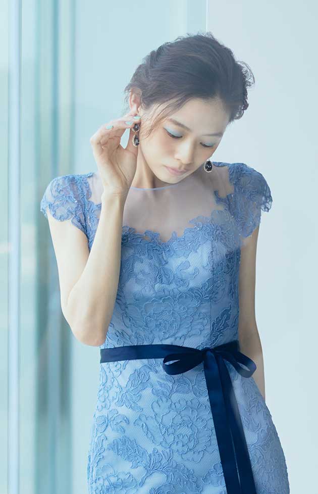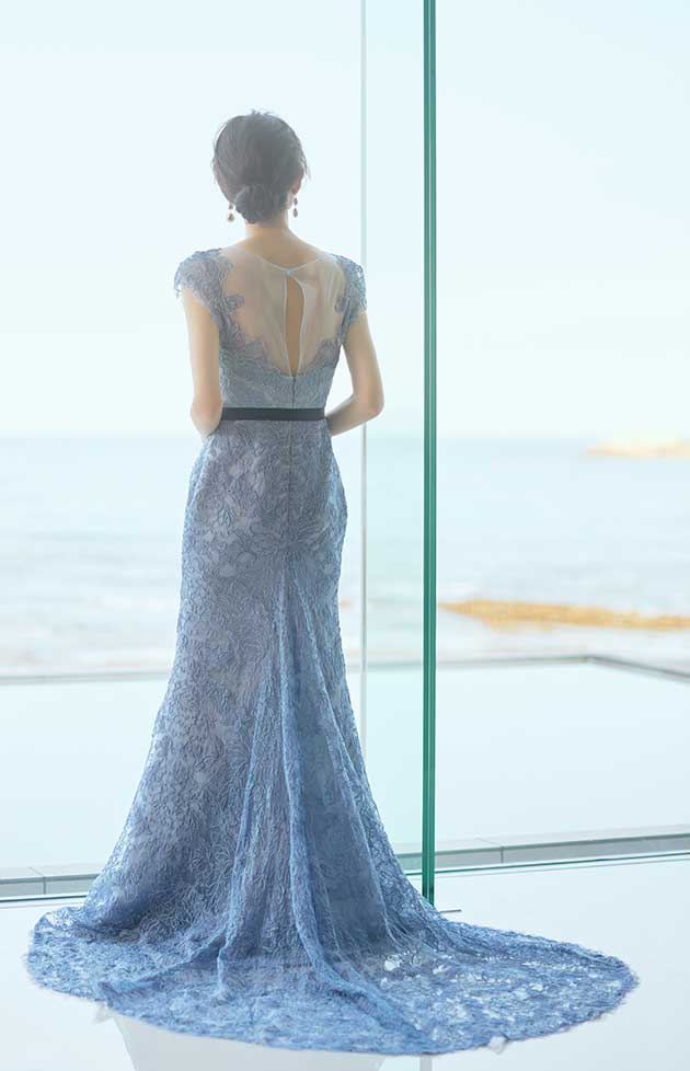 花言葉「幸福な愛」。繊細なレースに立体的なレースを重ねたブルーグレーのトランペットガウンのカラードレスです。繊細なイリュージョンネックにキャップスリーブがお顔周りを華やかに優しい印象に魅せてくれます。ブルーグレーの柔らかい色味にアクセントにウエストにネイビーリボンを飾ることできゅっと引き締まりスタイルアップが叶いますバックスタイルは高い位置から広がるトレーンが、後ろ姿までドラマチックに映します。