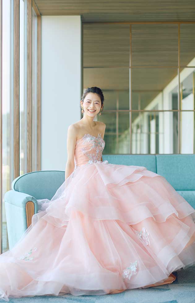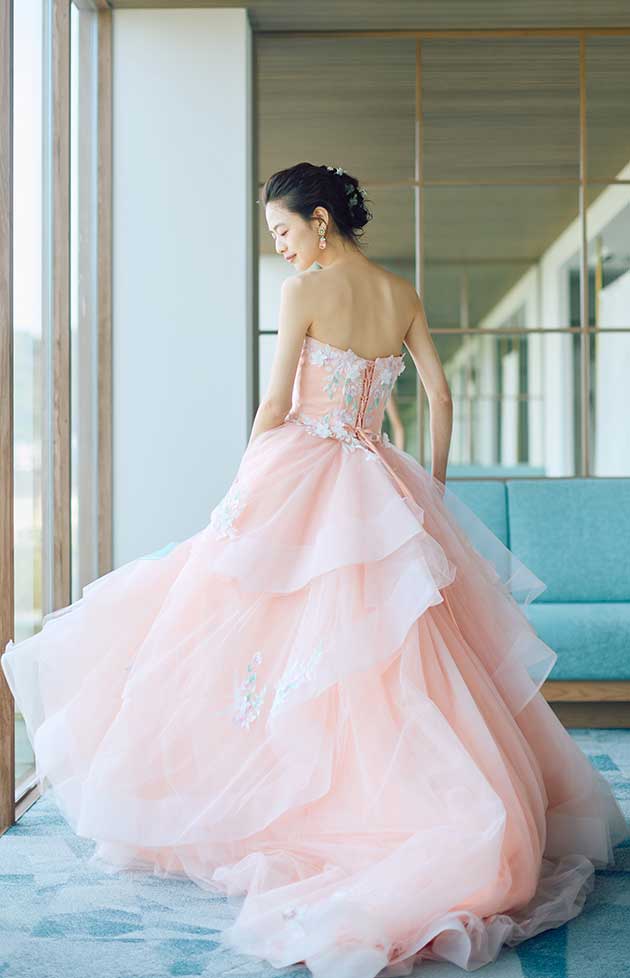 花言葉「優美な人・しとやか」。咲き誇るような3Dフラワーがドレス全体に飾られた、上品なサーモンピンクのカラードレスです。変形ラッフルスカートが動くたびに揺れる姿がエレガントで、角度によって雰囲気が異なり、様々な表情を魅せてくれます。
