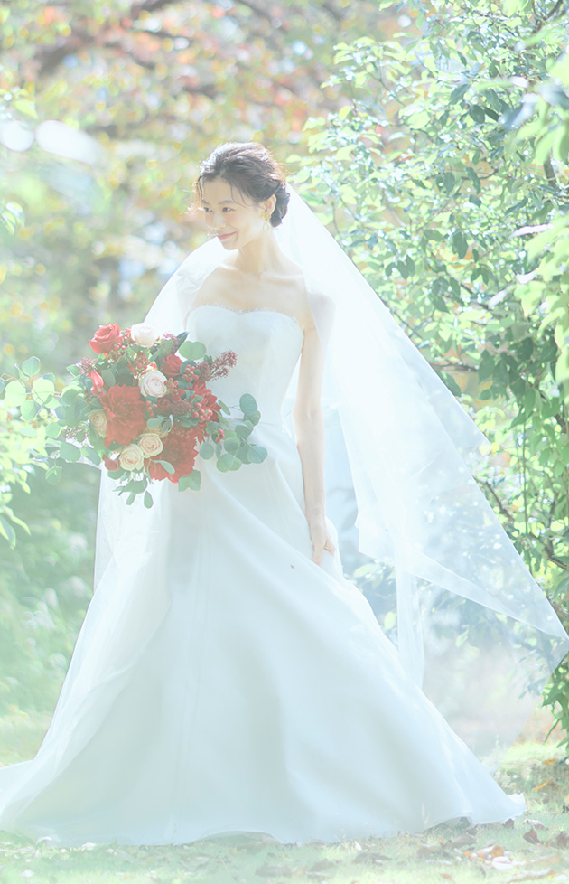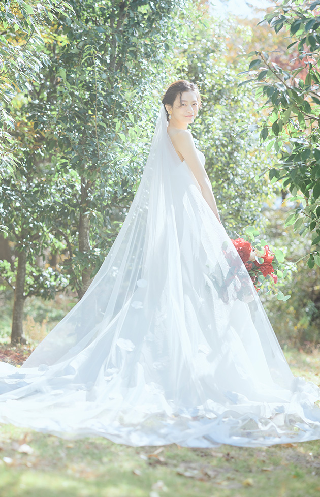 花言葉「愛」。繊細なレースのトップスに、透明感のあるオーガンジースカートの生地をたっぷりとつかった、シンプルなセミAラインのドレスです。チュールを贅沢に使ったボリュームオーバースカートを合わせることで大胆にドレスのラインや雰囲気を変えることができ、一着で着こなしを楽しんでいただけます。