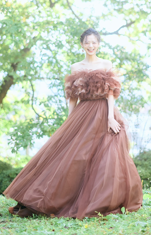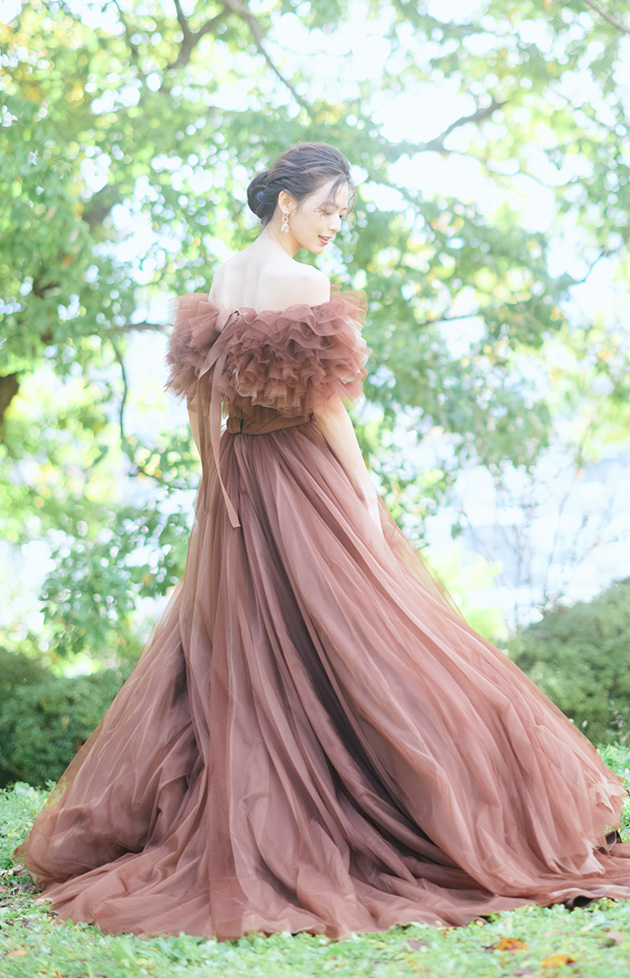 EC2420|花言葉「移り変わらぬ気持ち」。ベージュやブラウンのチュール生地を幾重にも重ねたチョコレートブラウンのカラードレスです。チュールを贅沢に使用したスカートは歩くたびにふわりと揺れ、座り姿もバックスタイルも主役感を演出します。取り外し可能なボリュームショールがデコルテラインを美しく、華奢に魅せ、お顔周りを華やかに映してくれるデザインです。