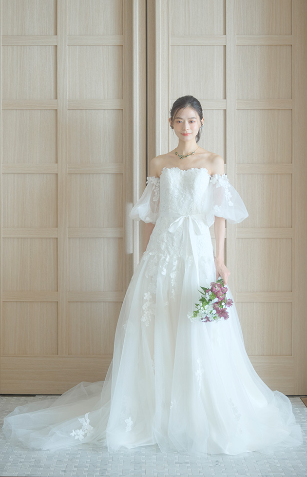 立体的なフラワーレースにさりげなくスパンコールをあしらった、纏うだけで女性らしさが引き立つセミマーメイドドレス。曲線美を際立たせるシルエットながら、チュールを重ねた柔らかな表情が、可憐な華やかさを添えます。トレンドのボリュームスリーブは、透明感のあるチュールにレースモチーフを散りばめ、袖全体がふんわりと柔らかなシルエットに。取り外し可能な2WAY仕様のため、ヘアスタイル、アクセサリー、ブーケまで、スタイリング次第でさまざまな表情を楽しめます。甘さと大人っぽさのバランスが絶妙で、等身大の可愛らしさを引き立てる一着です。