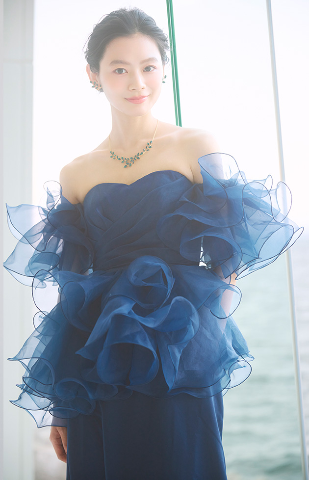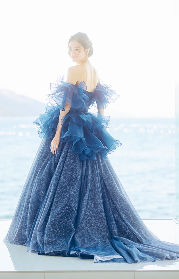 深みのあるネイビーカラーが肌を美しく引き立てる、4WAY仕様のカラードレス。ドレス本体はすっきりとしたスレンダーラインに、ボリュームスリーブ・ラメオーバースカート・ウエストフリルの3つの付属アイテムを組み合わせることで、シーンに合わせた多彩なスタイリングが叶います。披露宴ではオーバースカートやフリルをプラスして、グリッターの煌めきで華やかに主役感を演出し、二次会ではオーバースカートを外して抜け感のある洗練された装いに。特別な一日を、自分らしく楽しみたい花嫁さまへ贈る一着です。