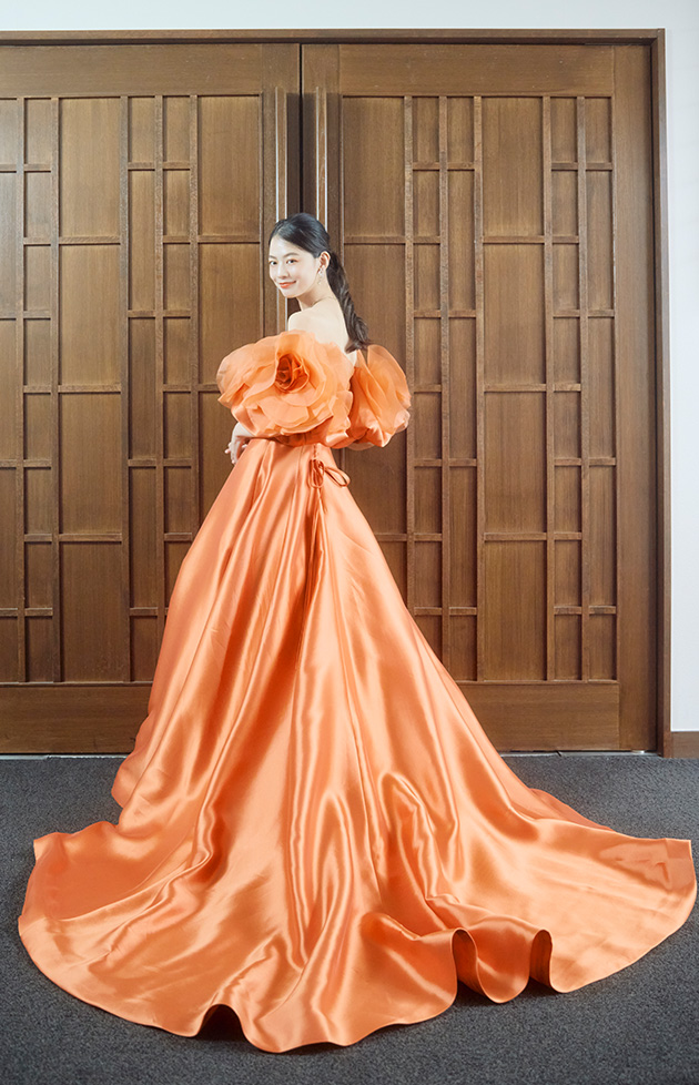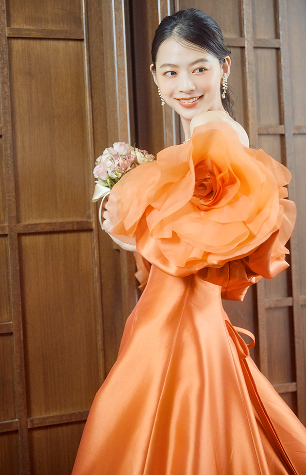 会場の視線を一瞬で惹きつけるテラコッタオレンジが印象的な一着。ミカド生地ならではの上質な光沢が、シンプルで美しいラインをよりいっそう引き立てます。ショルダーに咲く大輪のフラワーモチーフスリーブは、オーガンジーを立体的に重ねることで花びらのように咲き誇り、ロマンティックな印象に。写真に写った際もスリーブがアクセントとなり、肩まわりの華奢見えと圧倒的な写真映えを叶えます。特別な日にふさわしいドラマティックなカラードレスです。
